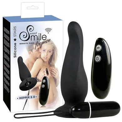 Geschwungener, innen hohler Plug, in dem das Vibroei mit 7 Vibrationsstufen und Silikon-Rückholband platziert werden kann. Mit Standfuß. 12 cm Gesamtlänge, Einführtiefe 10,5 cm, Ø 2 cm bis 4 cm.