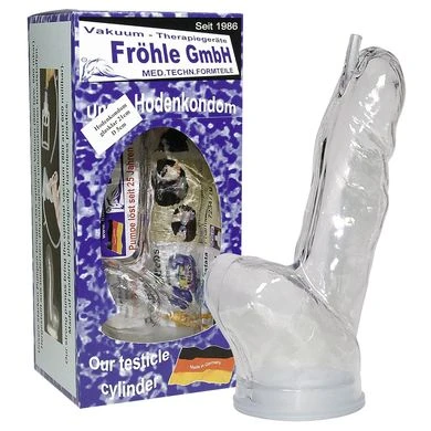 Medizinisch-technisch geprüftes Markenprodukt von „Fröhle“ zur lokalen Unterdruck-Behandlung des Penis. Beim Patentamt geschützt! Glasklarer Hoden-Kondom-Zylinder für das gezielte Potenz-Training, zur Prostata-Prophylaxe und für eine vermehrte Samenproduktion. 21 cm lang, Ø 5 cm. Inklusive Steckmanschette.