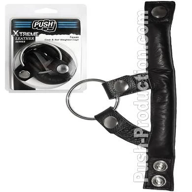 Der weiche Lederring ist für den Hoden gedacht und ist mit kleinen Metallkügelchen gefüllt. Dadurch wird der Ring ca. 190 g schwer. Über Druckknöpfe lässt sich der Durchmesser auf 35 und 50 mm einstellen.