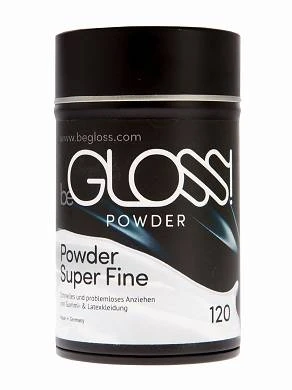 beGLOSS TALKUM POWDER 120 Gramm ist die schnelle Anziehhilfe – ideal für alle die kein Silicon Öl mögen. Es schützt und verhindert ein eventuelles Verkleben der Gummi & Latex Kleidung.